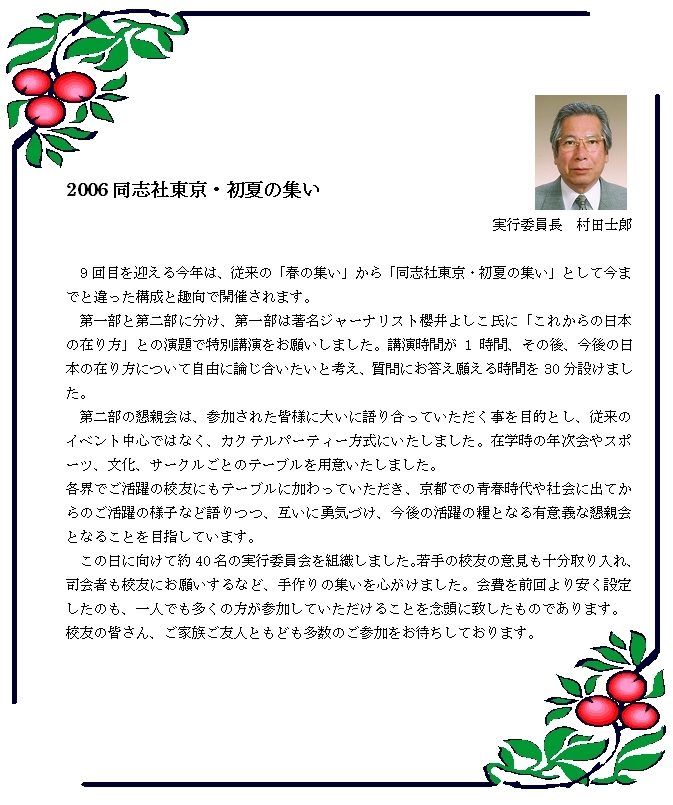 2006年6月3日(土)に行われました「2006同志社東京・初夏の集い」には550名余りの方々にお集まり頂き、お陰さまで盛大にかつ和やかに式典を開催することができました。これはひとえにご参加いただきました方々のご協力の賜物と、実行委員会一同心より感謝しております。ありがとうございました。