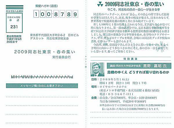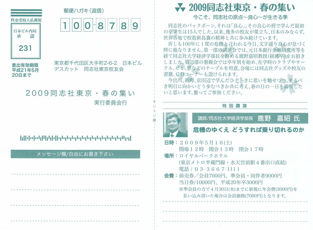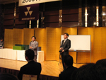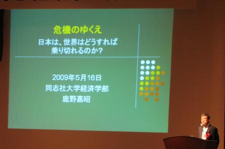第1部は、鹿野教授(同大経済学部長)の、「危機のゆくえ どうすれば乗り切れるのか」は、大変時宜を得た内容で、データを駆使した、「世界中の危機」の真の原因から、「今後の日本の景気」は今年終わりごろから回復基調に入るであろうという、流れるような講演で、聴衆を魅了しました。