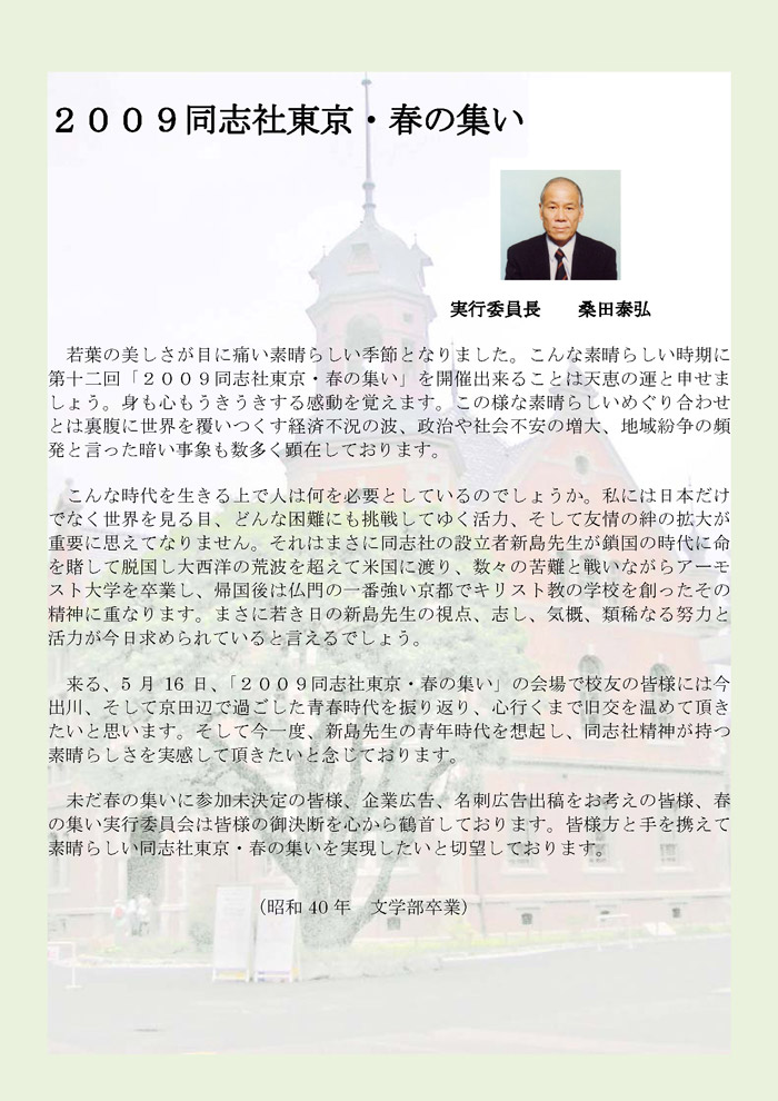 この模様は、丸山登さん(昭和33年・経済)撮影・編集の「春の集い記録DVD」で視聴することができます。DVDをご希望の方は同志社東京校友会事務局の方へその旨お問い合わせください。