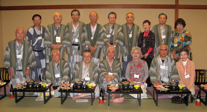 商学部OBの岡田浩一郎さんが経営する「ホテルおかだ」は、12階建ての大型温泉ホテル。この日集まったのは16人(女性4人)。うち会津旅行にも参加した人が14人います。年齢は73歳から77歳、人格・風格・品格、それに同志社スピリットを備えた立派な紳士・淑女の雰囲気を発散させていました。