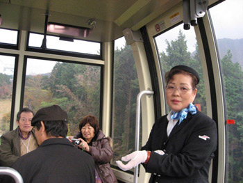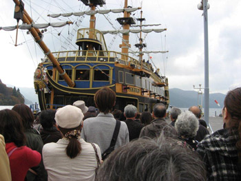 午前10時箱根湯本を出発して、宮の下―小湧園−箱根関所とまわり、海賊船と称する豪華大型客船に乗って、桃源台。ロープウエイに乗り継ぎ、大涌谷。硫黄の煙と匂いを見たり、嗅いだりしながら再びロープウエイで、早雲山。ケーブルカーに乗り換え、強羅に着く。午後2時35分。迎えのバスに乗って甘酒茶屋で休憩。山々の紅葉は、すっかり色づき、錦の織物を纏ったようでした。秋景色を堪能したところで下山。箱根湯本から「鈴廣かまぼこの里」に案内されたころ、天気予報どおりに雨が落ちてきましたが、これまでの2日間は天気にも恵まれました。同4時30分、小田原駅に着き、解散となりました。