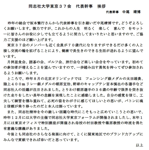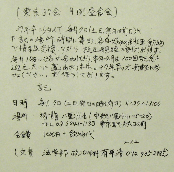 | 東京37会第21回総会・懇親会が3月6日午後1時から新宿の「アゴラ」で開催された。今年は昨年より約10名多い57名が出席。