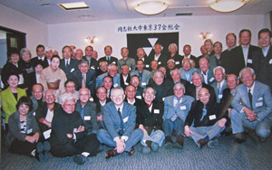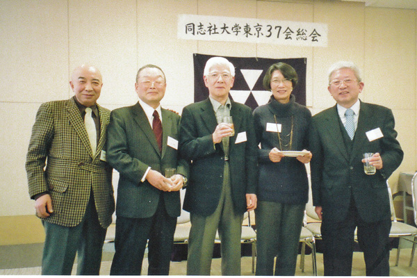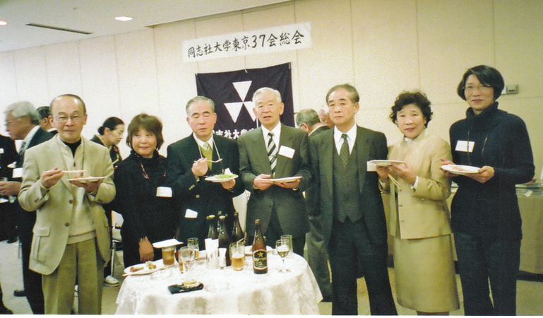 司会が荻田倫男幹事に交代、従来は会食・歓談だけだったが、今年から趣向を変え、河村時孝氏の指揮で「みんなで歌おうかい」と洒落こみ、「学生時代」「カチューシャ」など懐かしの歌と「同志社大学歌」を久しぶりに歌った。最後に岸和田晶子、小山芙美子両氏からカレッジソングの由来について原曲は米国のイェール大学も校歌に採用しているドイツの「ラインの守り」で、作詩は近江兄弟社創設者のW.M.ヴォーリズ氏だとの説明があり、全員で斉唱のあと同志社チアーで締めくくった。