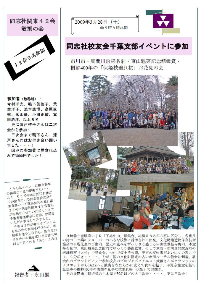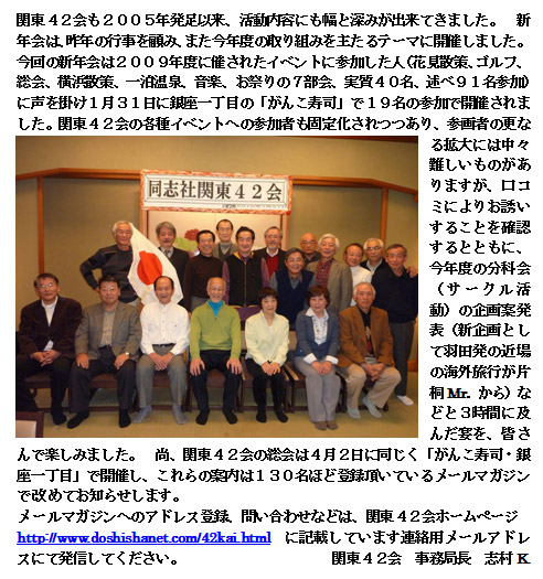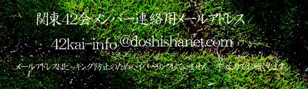 同志社関東42会会員相互の意思疎通を円滑化する目的で42会専用のBLOG(ブログ)および掲示板を開設することが先の幹事会にて決定され、早速試験運用が開始されました。これは登録会員専用のためログインIDおよびログインパスワードがないと入室できません。まだ当会に入会登録されていない方は入会手続きもあわせてお願い致します。