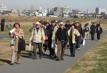健康と親睦を目的に自分のペースで東京を歩こうというのが本会の主旨です。東京各地を順次歩く予定です。月1回、朝10時集合3時ごろ解散で約10キロ歩きます。途中公園などで弁当を食べます。参加は自由、途中参加もリタイヤもOKです。気楽にやるのがモットーです
