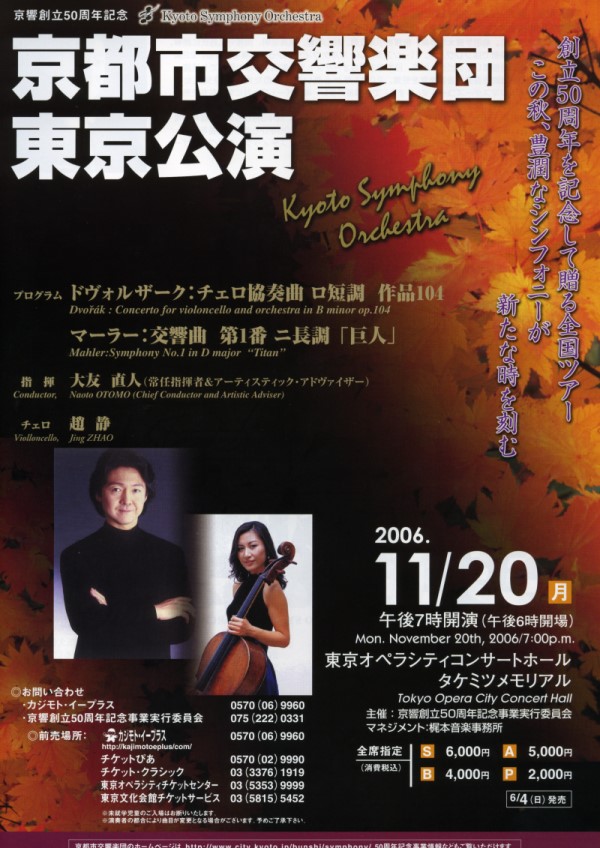 新潟や福岡などでは狂言師(茂山千三郎氏ほか)とオーケストラのコラボレーションという京都ならではのオリジナルステージをご用意。東京では、マーラーの「交響曲第1番」とドヴォルザークの「チェロ協奏曲」という名曲プログラムをお聴かせします。