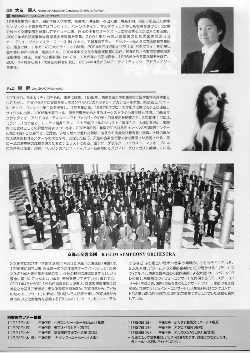 | 私ども同志社女子大学のOG4名が活動をしております京都市交響楽団が、今年楽団結成50周年を迎え11月に国内ツアー(北海道、東京、新潟、大阪、福山、福岡、佐世保)を開催します。