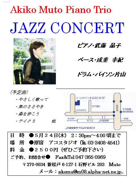 ピアノトリオによるジャズ演奏を 原宿(歩3分)でやりますので、