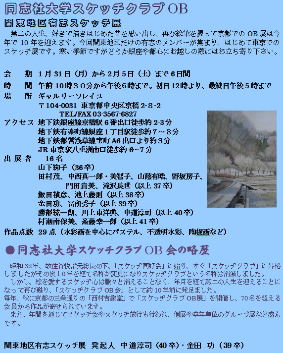 このページにデジカメ写真をご提供ください。趣味のトレッキングで写したもの、ご自慢コレクション、ご自宅の庭に咲いた可憐な花、旅の思い出、京都を思い出させる懐かしい写真、最近の京都の風情、等々良識の範囲のものであればジャンルは問いません。ただ、宣伝色の濃いものについては掲載できません。事務局宛にe-mailでいただければ幸いです。 また、その他作曲、作詞、各種歌・唄等についてもここで発表あるいはお知らせをされてください。ただしコンサートは別ページにさせていただいています。 掲載期間については当広報委員会の判断に委ねさせていただきます。残念ながら記念品や謝礼金はありません。 |