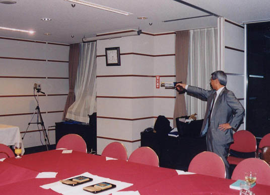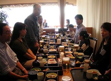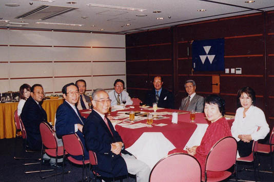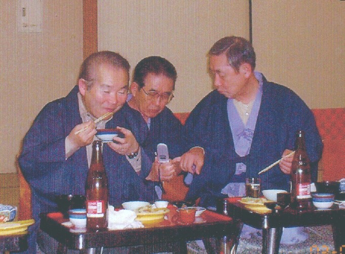 初日は家田サン宅に集合してバスにて目的地に向かい、途中で2005年に開催予定の「愛知万博」に向けて突貫工事中の名古屋・瀬戸の両市に跨る会場予定地を車上より見学してその広大な敷地にただ驚くばかりであり、万博終了後は如何なるのだろうと喧喧諤諤の後ち猿投温泉に無事到着し、早速、持ち寄った「秘宝」の数々の恒例のオークションを開き、幾ばくかを選友会の運営資金としました。かすかに硫黄の匂いが漂う温泉にて一風呂浴びた後は、和式の大宴会場にて夕食会となり、半年振り(一部は初参加)の話題に花を咲かせました。