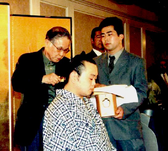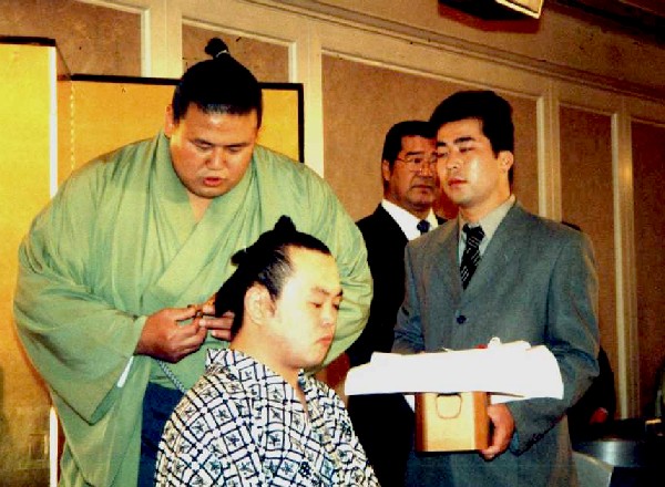 伊勢ノ海親方は当番にあたっておられ遅れての到着。開口一番、この上階には魁皇関と優勝旗がきております、と会場を和ませてくれました。続いて、今場所限りで引退し、第二の人生を歩むことになった藤縄力士の断髪式が執り行われ、参加者もはさみを入れるため列を作りました。