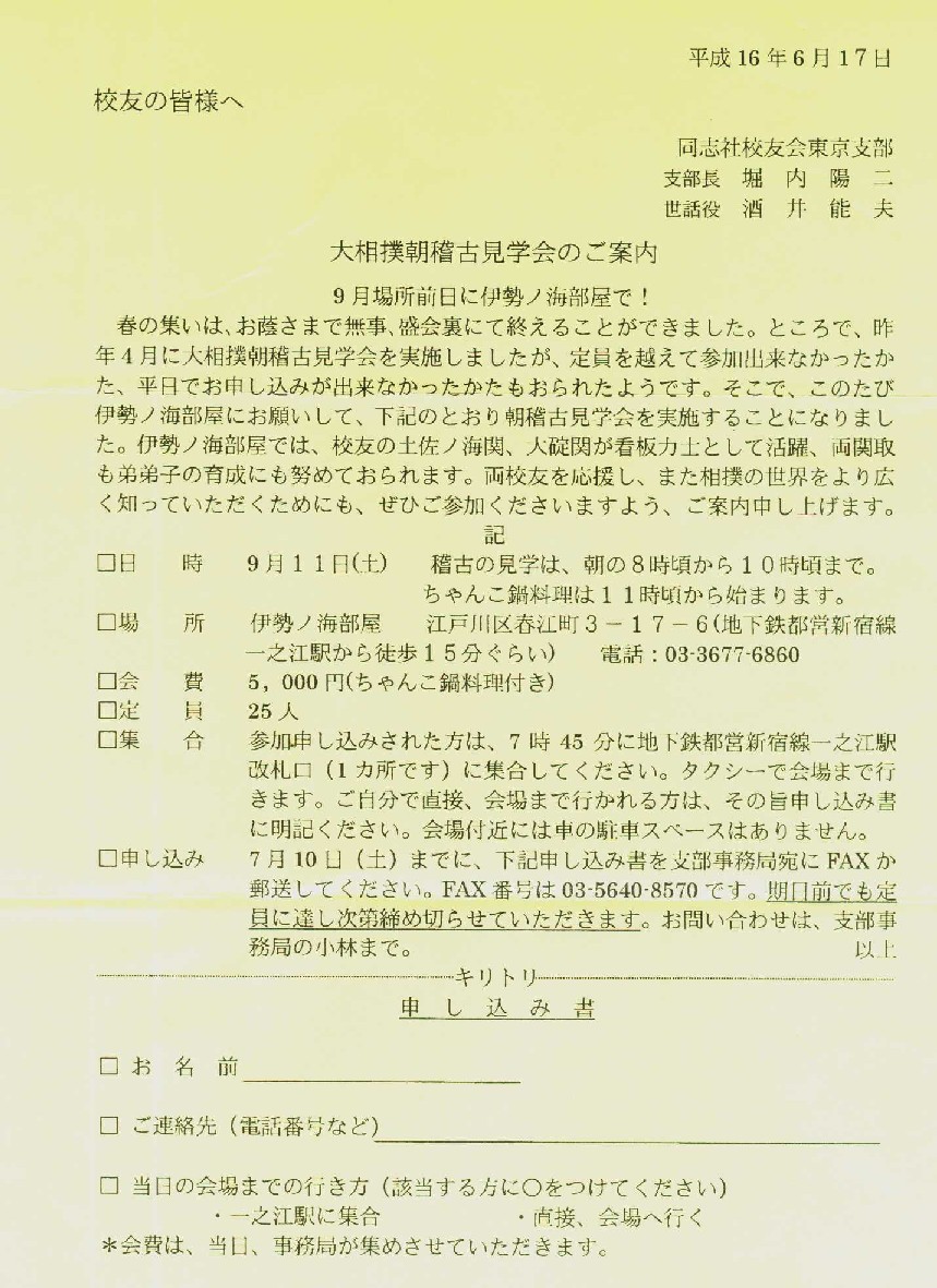 本年も朝稽古見学会を実施することになりました。伊勢ノ海部屋では、校友の土佐ノ海関、大碇関が看板力士として活躍、両関取も弟弟子の育成にも努めておられます。両校友を応援し、また相撲の世界をより広く知っていただくためにも、ぜひご参加ください。