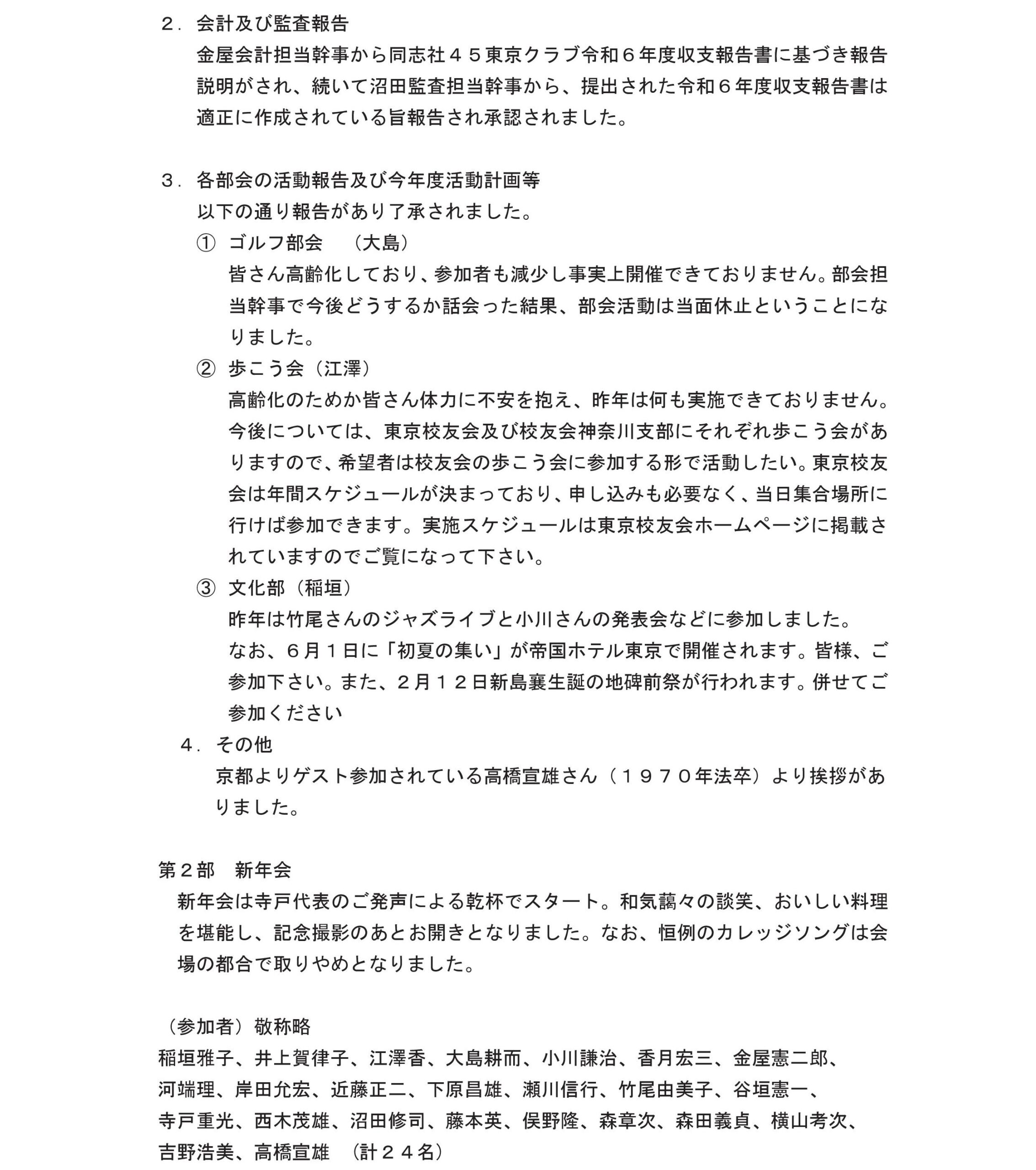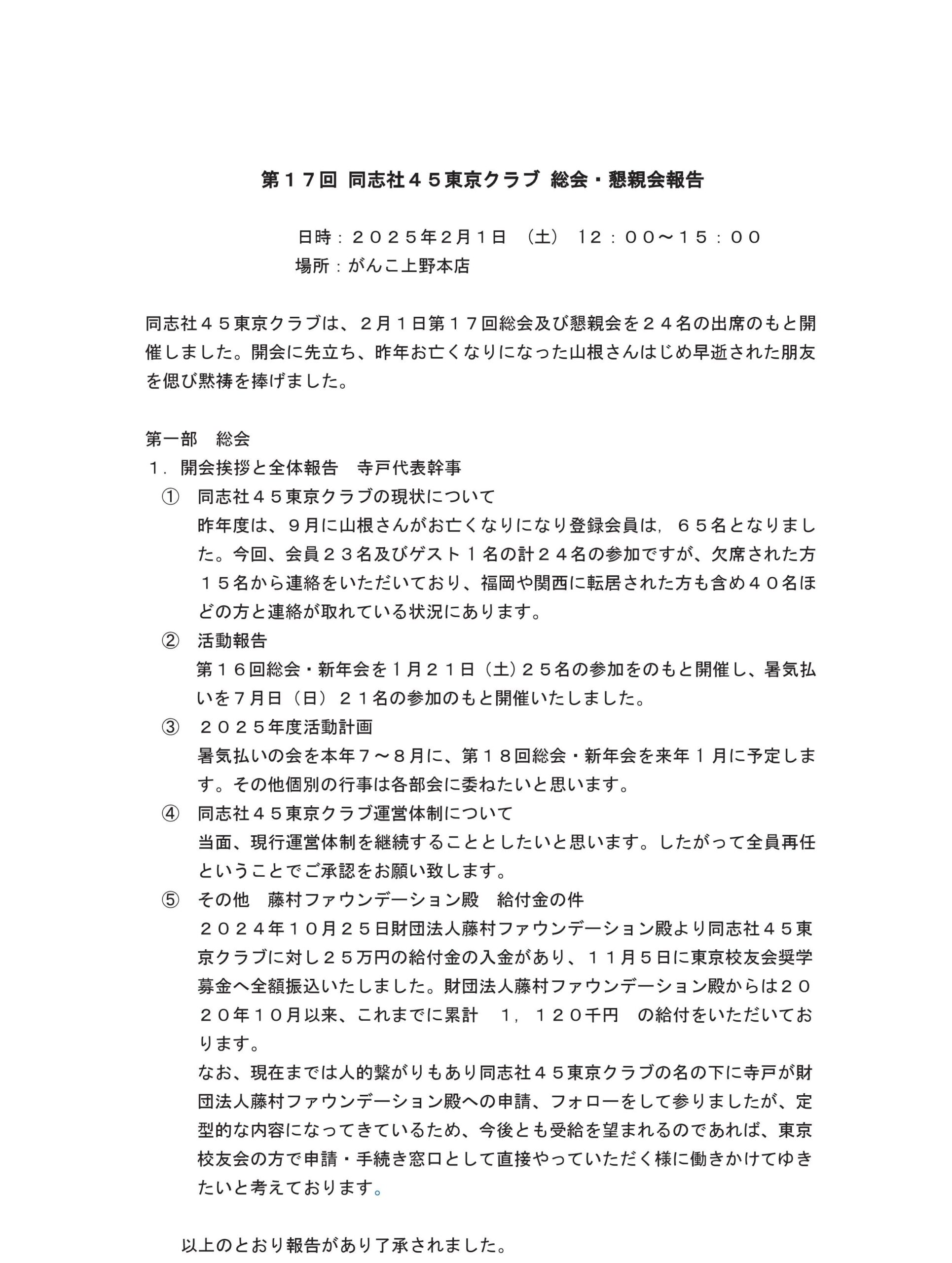 4. 第17回 同志社45東京クラブ 総会・懇親会報告