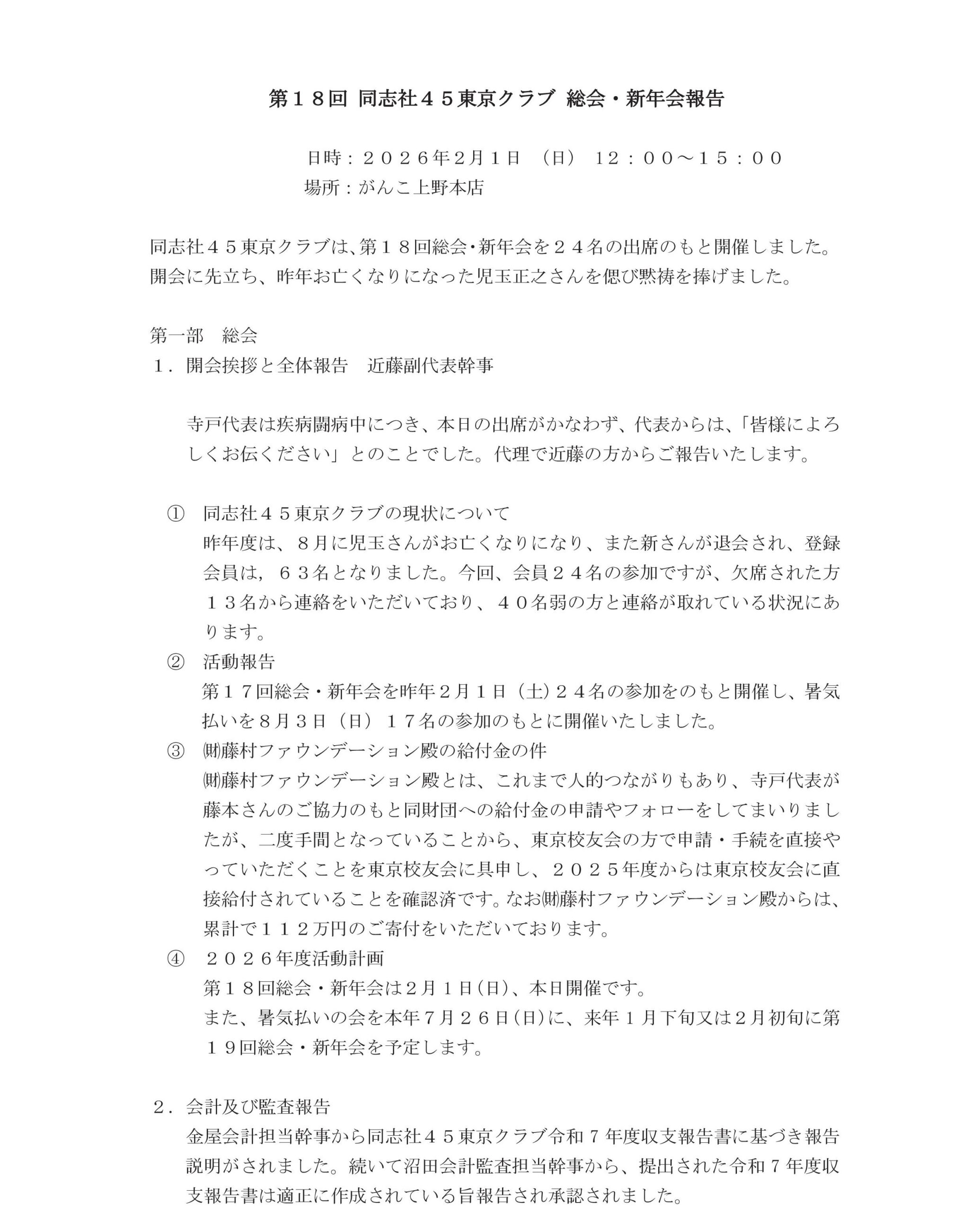 4. 第18回 同志社45東京クラブ 総会・新年会報告
