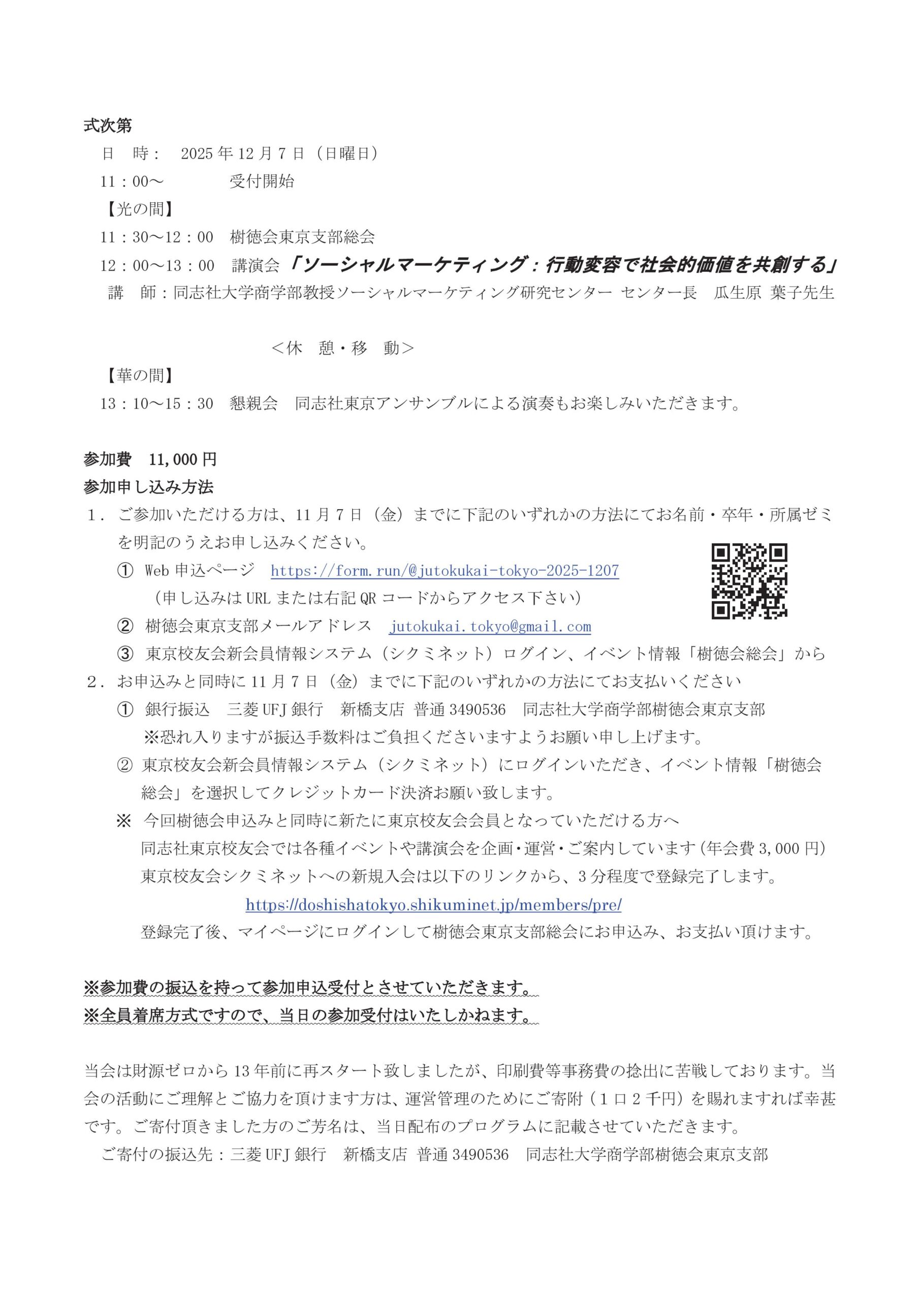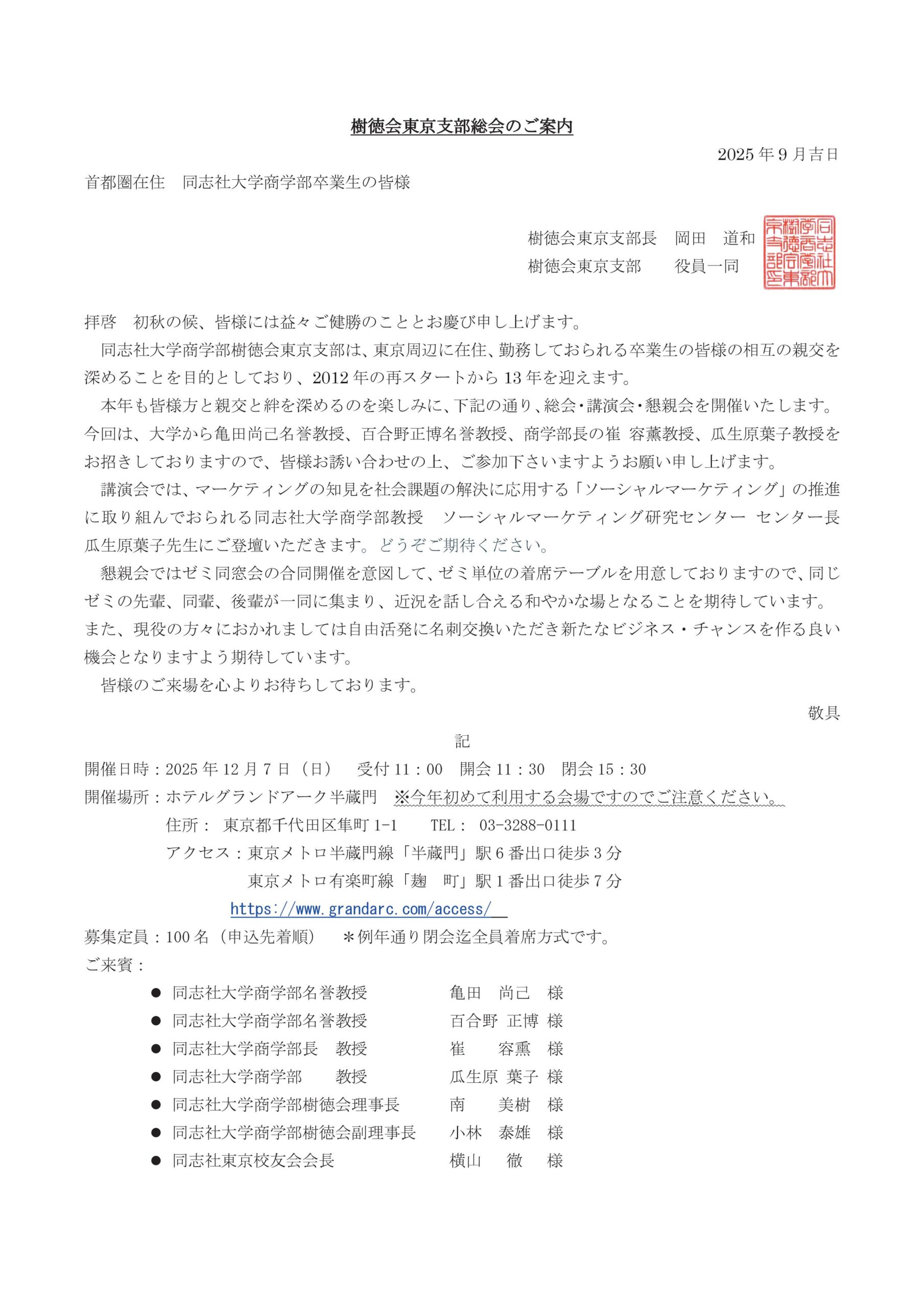 地域支部学部ゼミOB・OG会 樹徳会 東京支部 東京支部総会のご案内【12月7日(日)】 2025.09.11 お申込み Web特設ページ 樹徳会東京支部 E-mail 東京校友会新会員情報システム(シクミネット) ログイン 東京校友会シクミネットへの新規入会は、こちら ホテルグランドアーク半蔵門