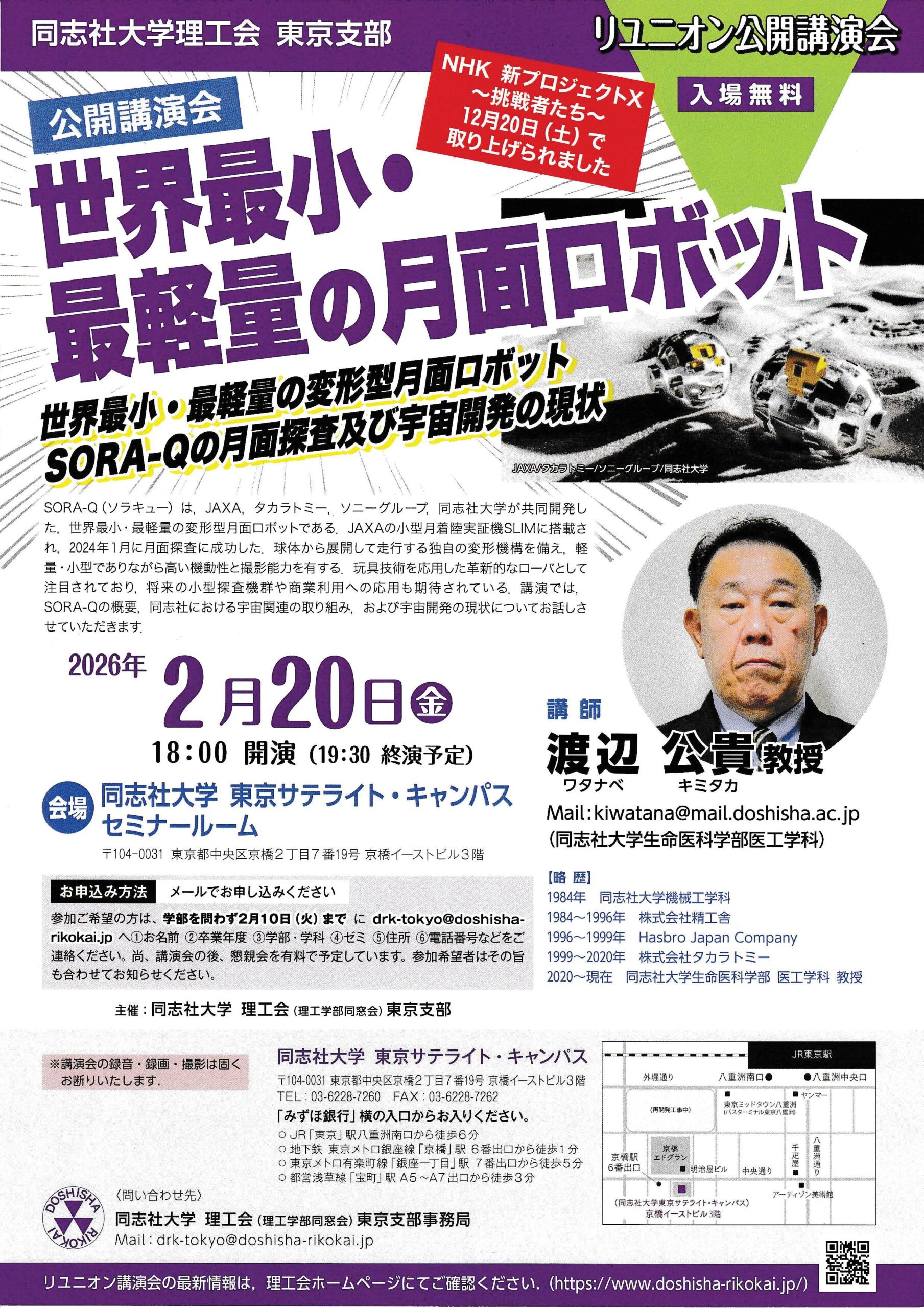 渡辺先生は、昨年末NHKの新プロジェクトXで取り上げられ、先生が中心になって開発された世界最小・最軽量の月面ロボットSORA-Qを2024年1月に月面に送り届け、月面探索に成功された中心人物です。