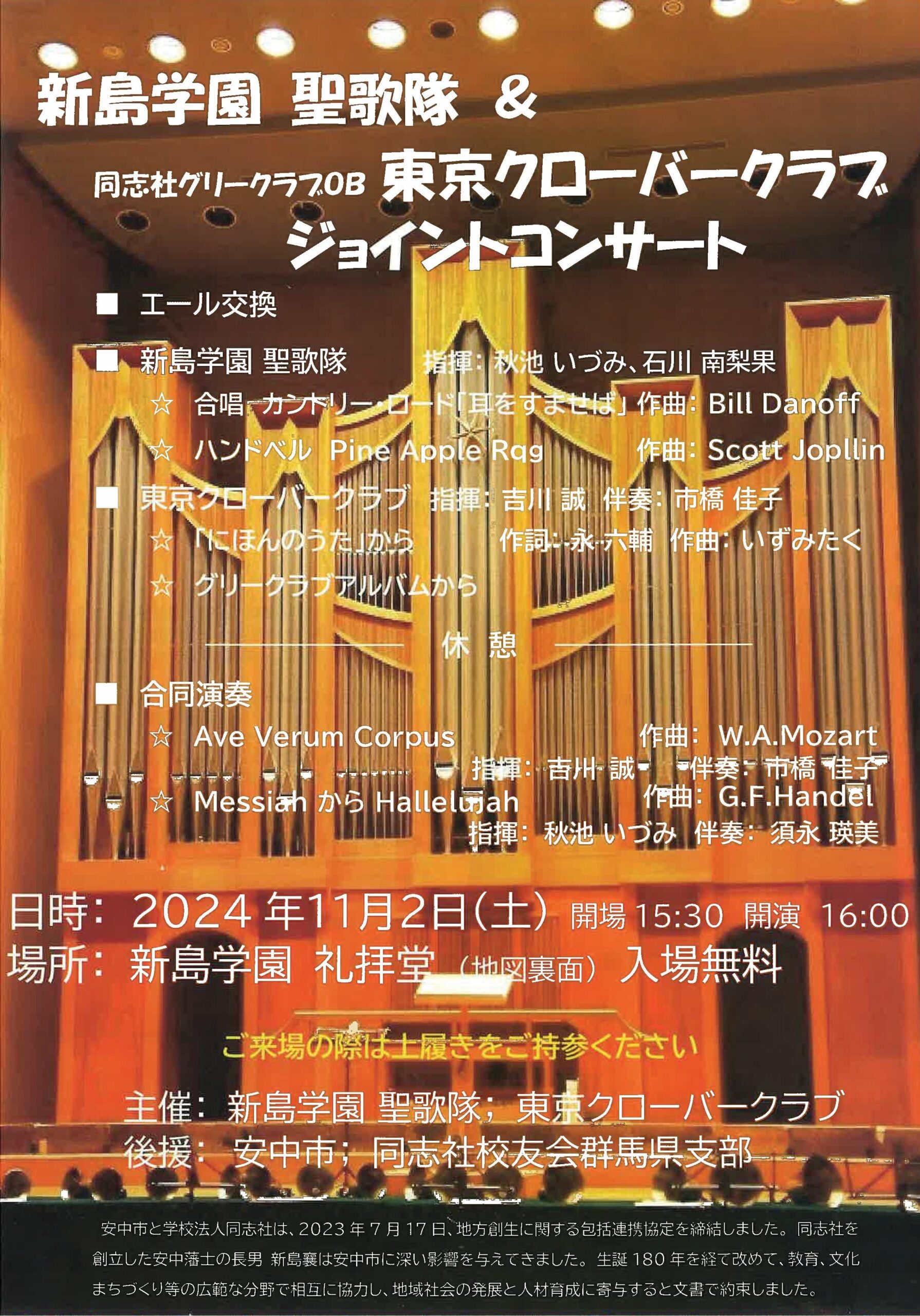 観に行こう・聴きに行こう 新島学園聖歌隊 & 東京クローバークラブ ジョイントコンサート【11月2日(土)】 2024.10.10 新島学園聖歌隊 & 東京クローバークラブ ジョイントコンサート 日時:2024年11月2日(土) 開場15:30 開演:16:00 会場:新島学園 礼拝堂(〒379-0116 群馬県安中市安中3202 TEL:027-381-0240) アクセス JR安中駅から徒歩15分 入場料:無料 *ご来場の際は上履きをご持参ください。