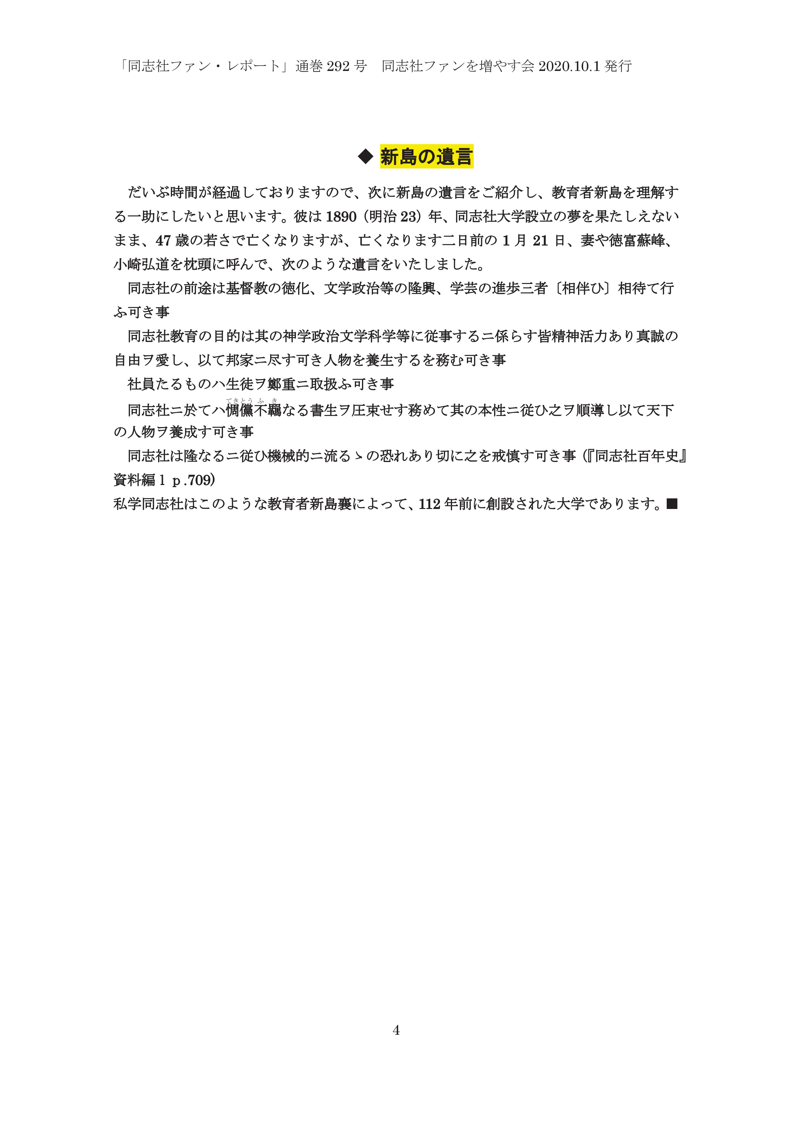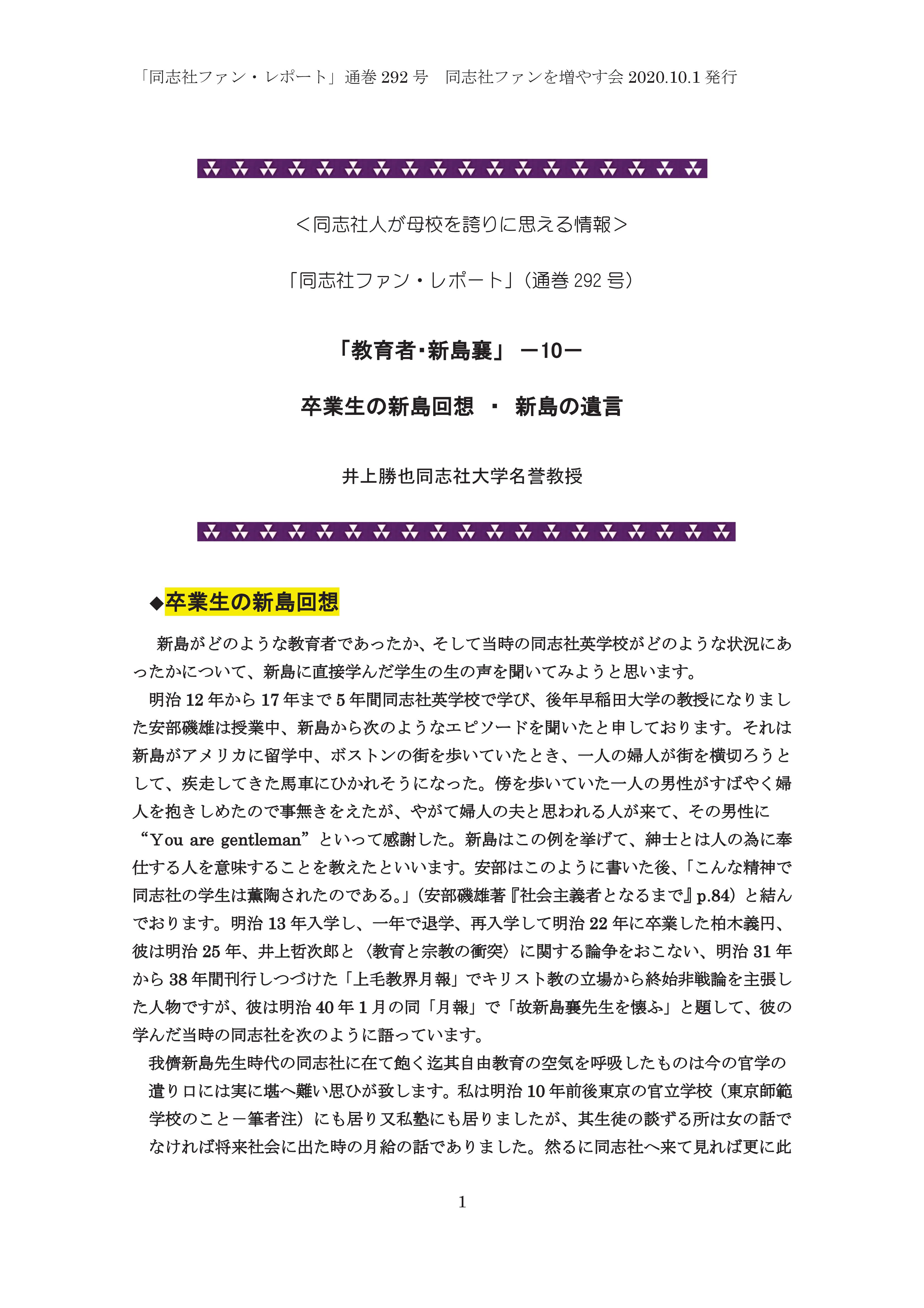 「教育者・新島襄」 -10- 通巻292号 2020/10/1発行