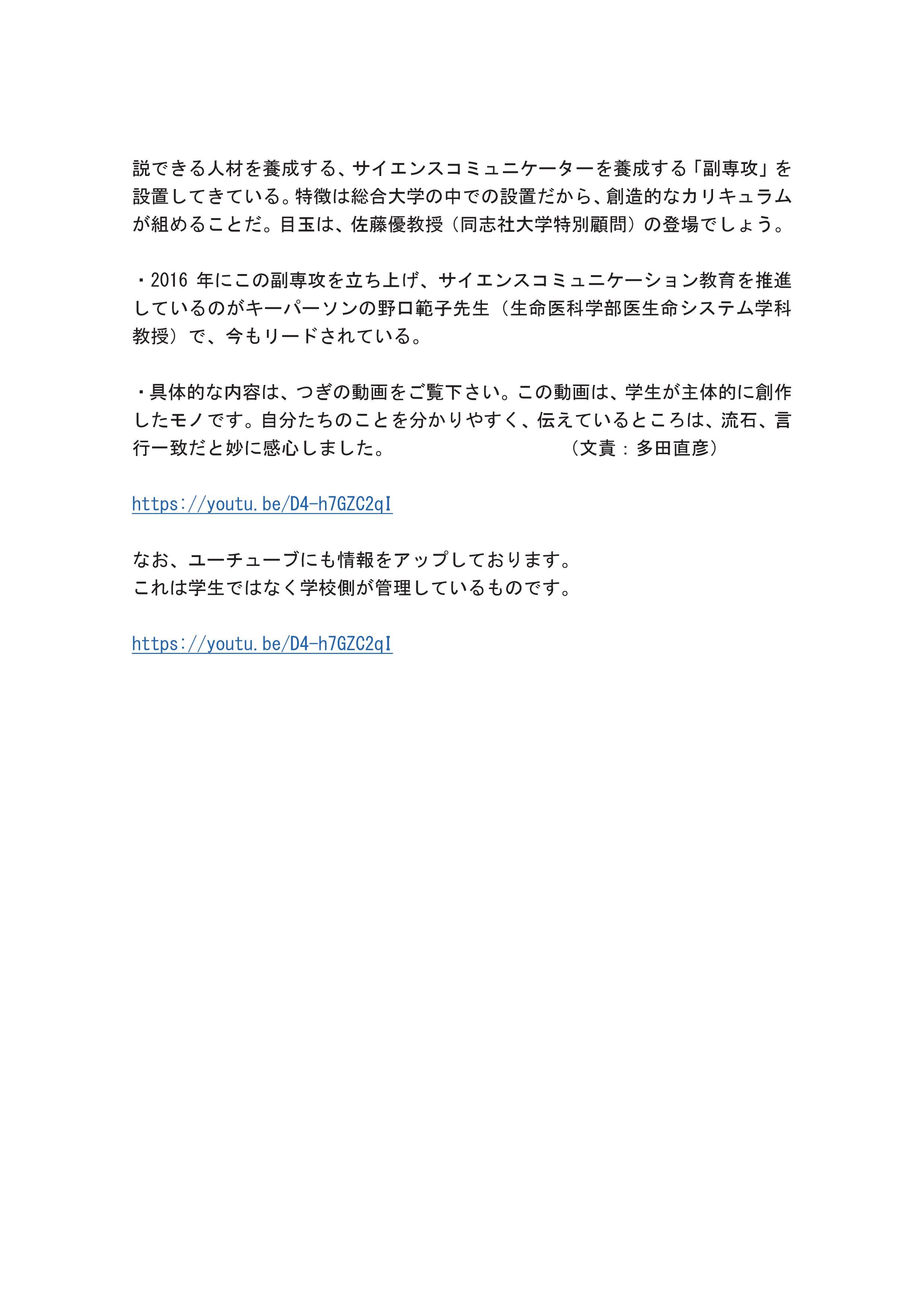 サークル活動 同志社ファンを増やす会 【Doshisha-now】 №001 ~ サイエンスコミュニケーター ~ 通巻311号 2021/7/2 2021.07.06 https://youtu.be/D4-h7GZC2qI