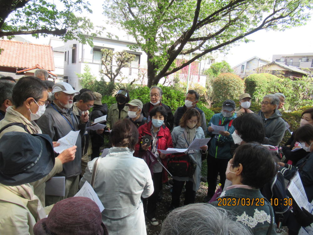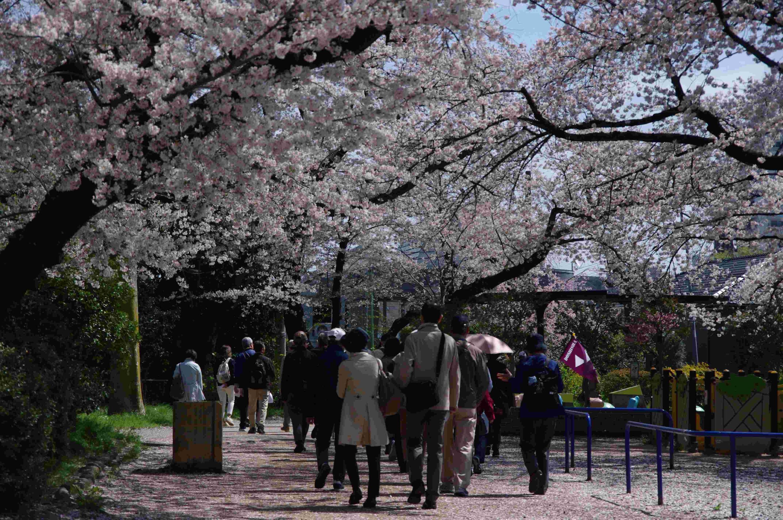 玉川上水第二公園は、浅間橋から続く暗渠部上部の公園。上水路の上には盛り土がなされ上部は杉並区立公園となっています。遊歩道の両側にはたくさんの樹木が整備され、ソメイヨシノを始め、満開のお花見をしながらの歩く会となりました。