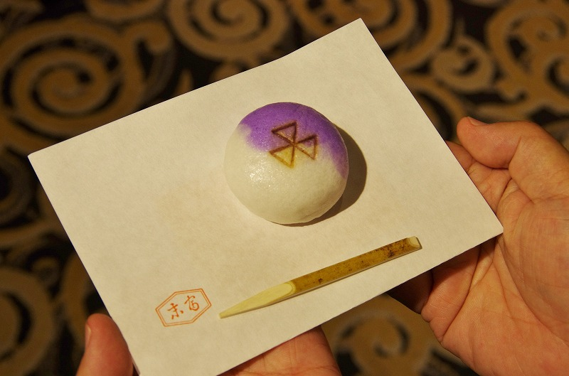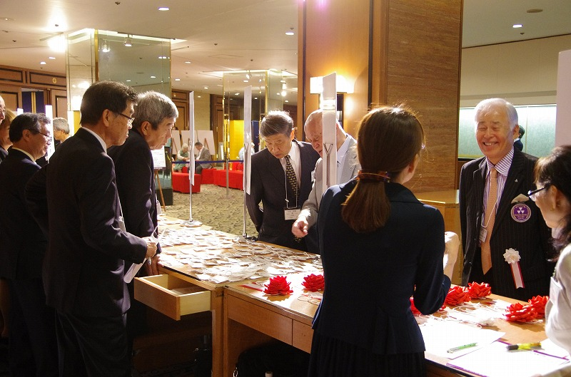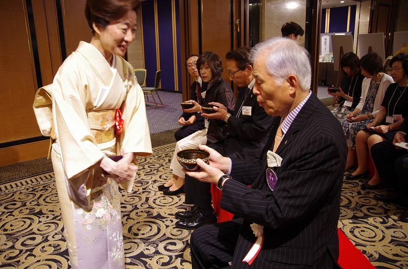 会に先立ち、ホワイエでは本日の講師、千玄室大宗匠のご好意による菓子、抹茶のご提供があり、