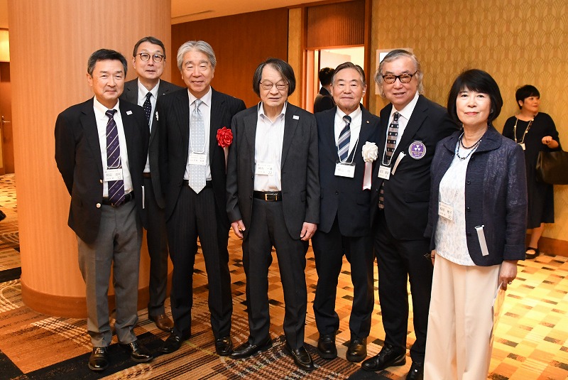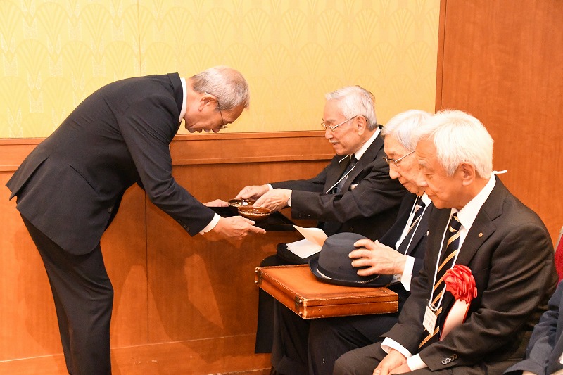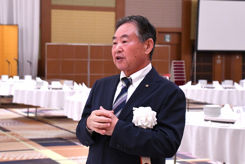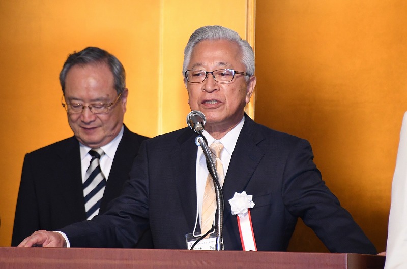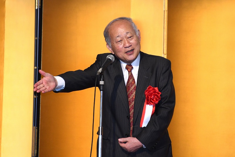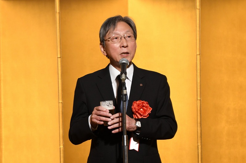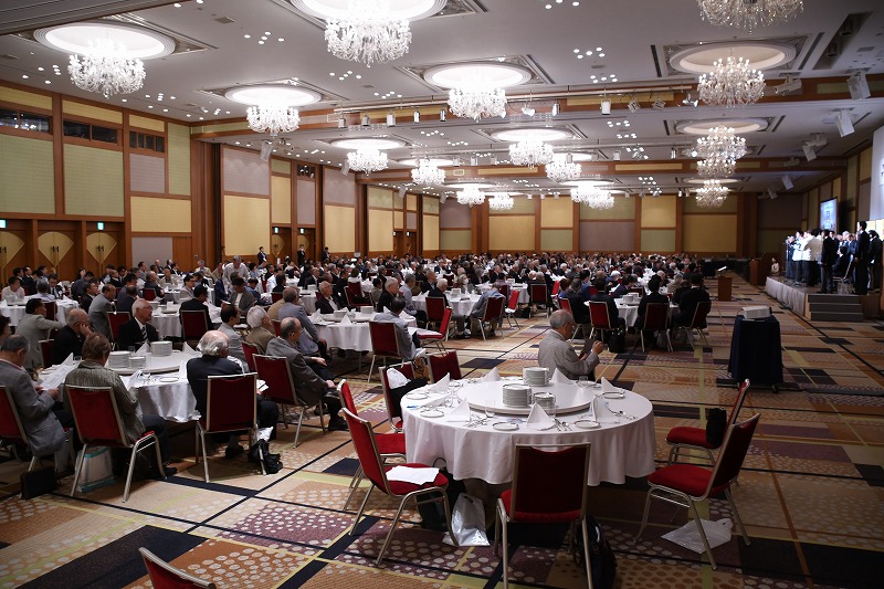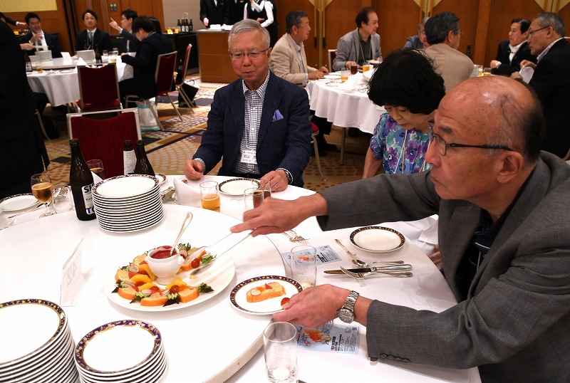 午後2時を過ぎ、皆さんのお腹も空いた頃、懇親会が始まりました。ご来賓を代表して八田英二同志社総長・理事長からご祝辞をいただき、松岡敬校友会長のご発声により全員で乾杯の後、ホテル自慢の料理と歓談で大いに盛り上がりました。