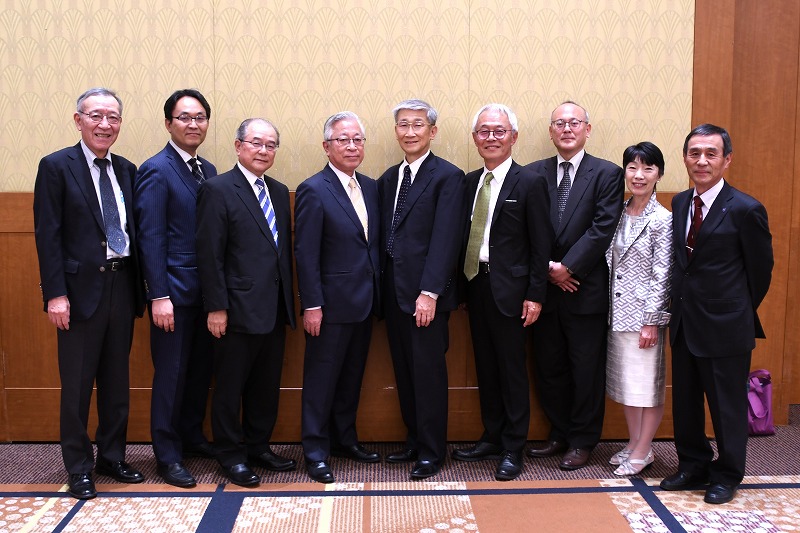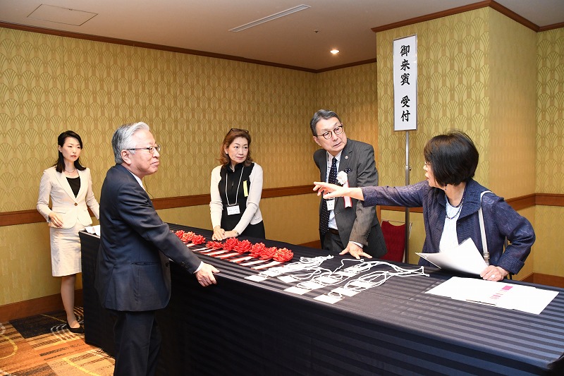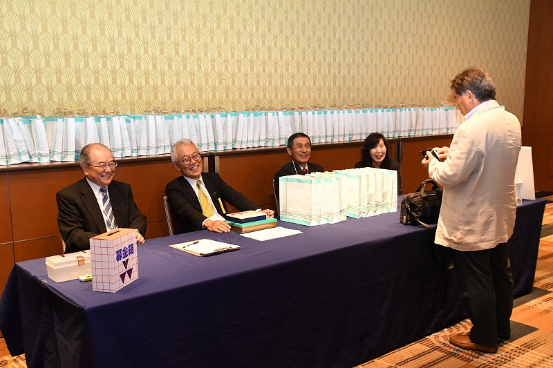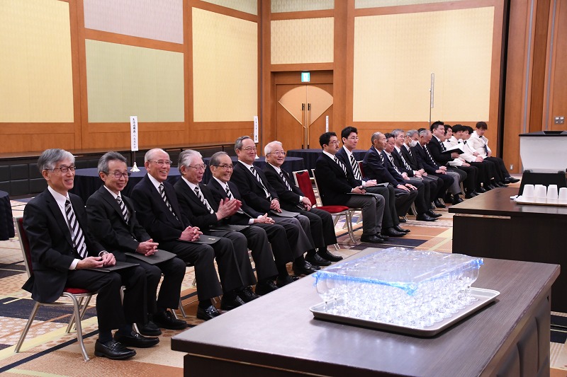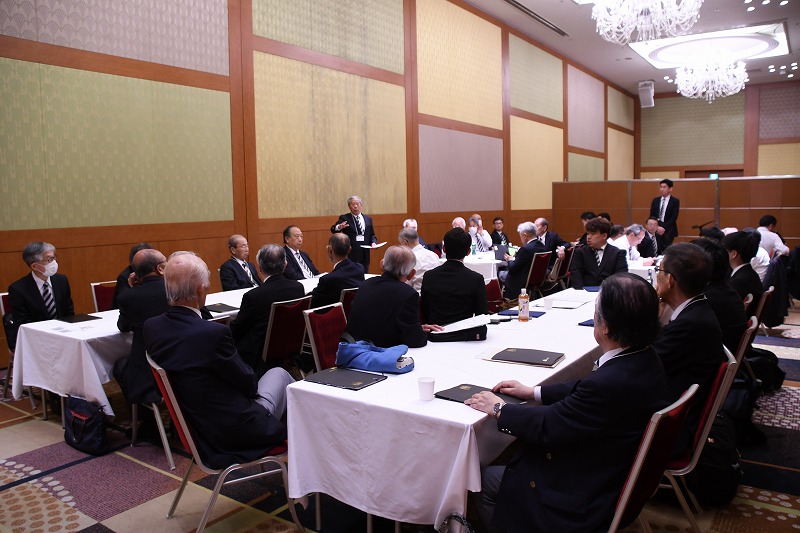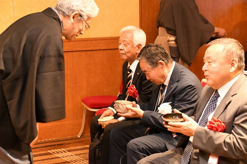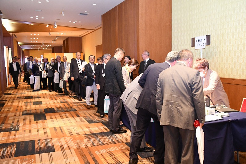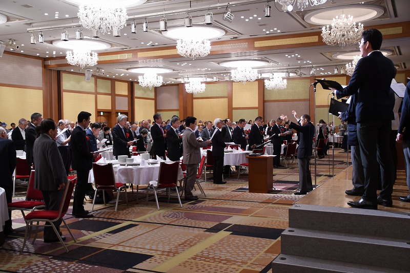 午後2時を過ぎ、皆さんのお腹も空いた頃、懇親会が始まりました。ご来賓を代表して八田英二同志社総長・理事長からご祝辞をいただき、松岡敬校友会長のご発声により全員で乾杯の後、ホテル自慢の料理と歓談で大いに盛り上がりました。