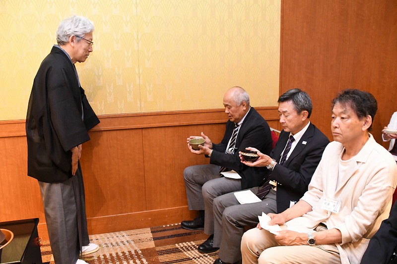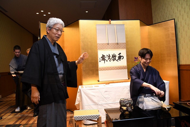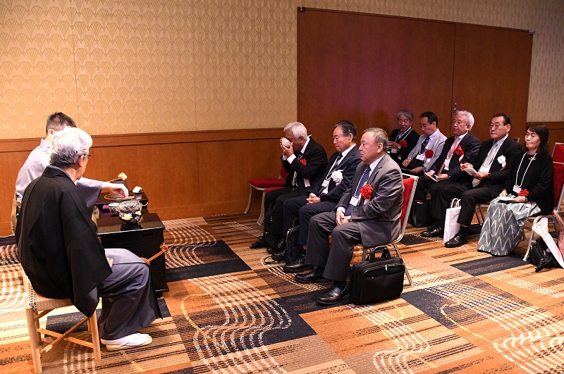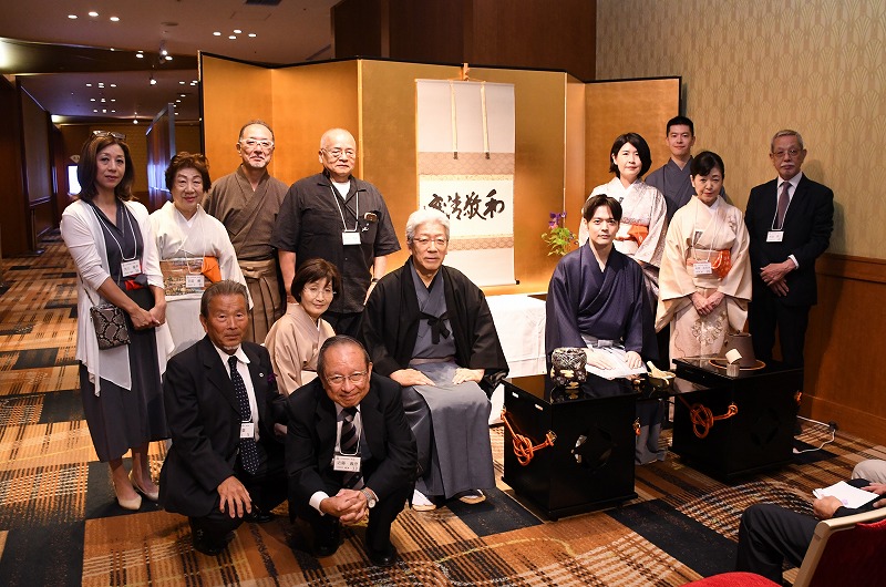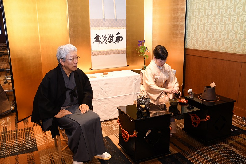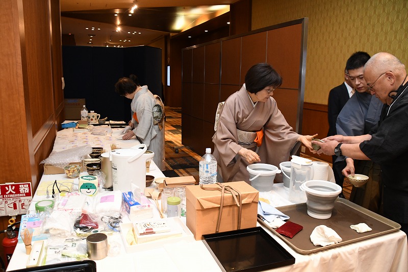 好天に恵まれた当日の朝、正午の開会に向けて実行委員と協力者で準備を進める一方で、茶道倶楽部によるお呈茶席の用意も着々と進められました。昨年発足したばかりの茶道倶楽部から12名の皆さんによるお呈茶のおもてなしで開会前のひととき、ご来賓や校友の皆さんが心尽くしの一服を満喫されていました。