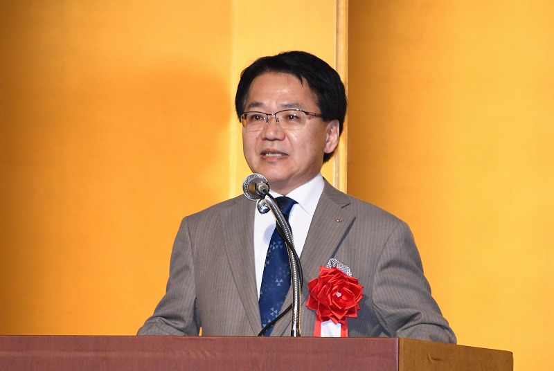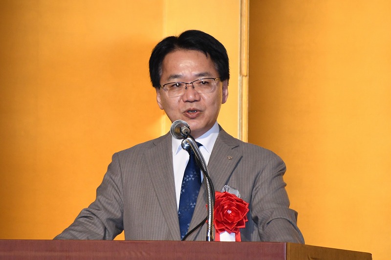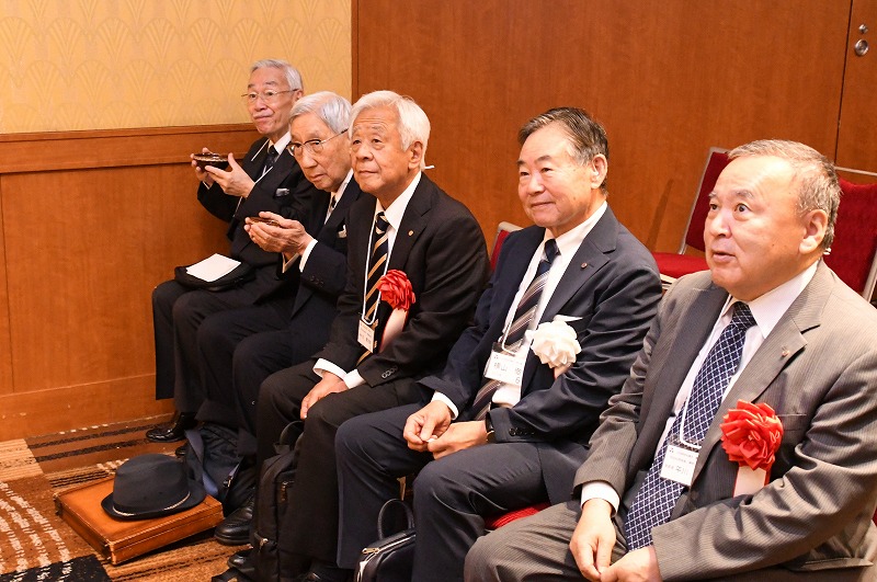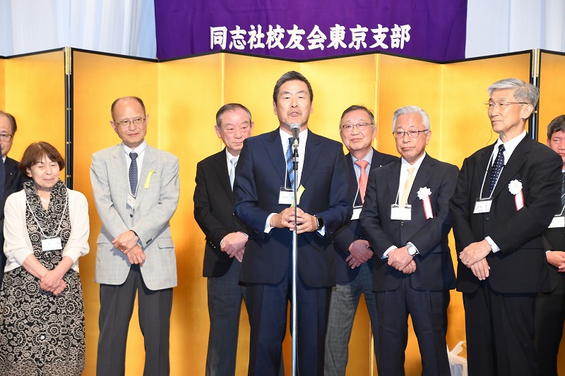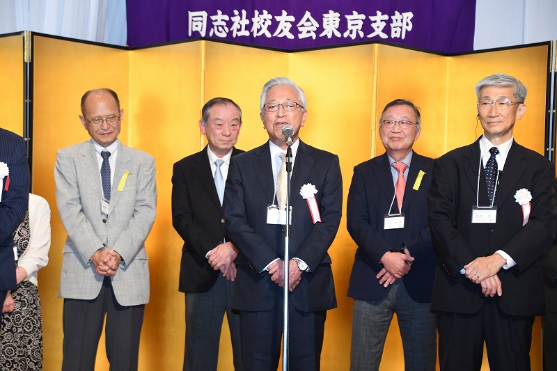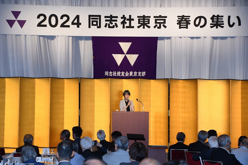 まず横山徹東京校友会長から主催者挨拶。続いて今年4月に就任された小原克博学長、同志社女子大学の小﨑眞学長が相次いで登壇され、それぞれご挨拶をいただきました。お二方とも「春の集い」には初めてご来臨賜り、150周年に向けた取り組みへの熱い想いなど貴重なお話をお聞かせいただきました。