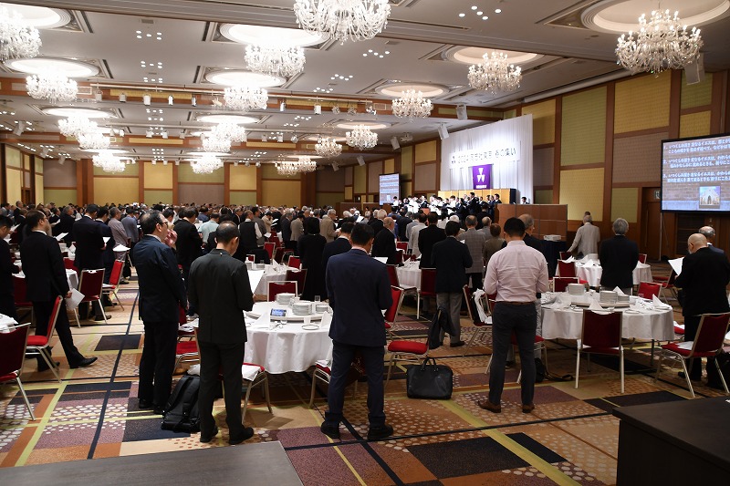 続いて大学院神学研究科修了で桜美林大学チャプレンの佐原光児准教授による開会祈祷が行われました。次に讃美歌斉唱に進むところ、なんと! 機器操作不手際により前奏が流れないという大失態! 蒼ざめて焦っているところに神のご加護かクローバークラブ指揮者から「こちらでリードしましょうか」との助け舟。ありがたくお願いして無事参加者全員で讃美歌を斉唱いただくことができました。