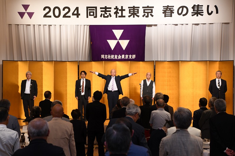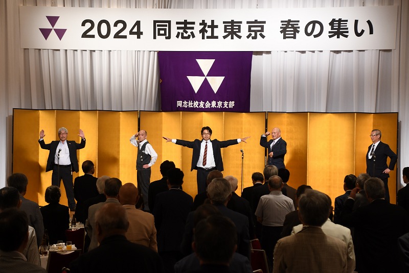 懇親会のフィナーレは恒例の應援團OBによる演舞です。藤田昇良関東OB会長をはじめ5名の皆様の力強い演舞によって、皆さんの同志社愛はさらに強固なものになったことでしょう。