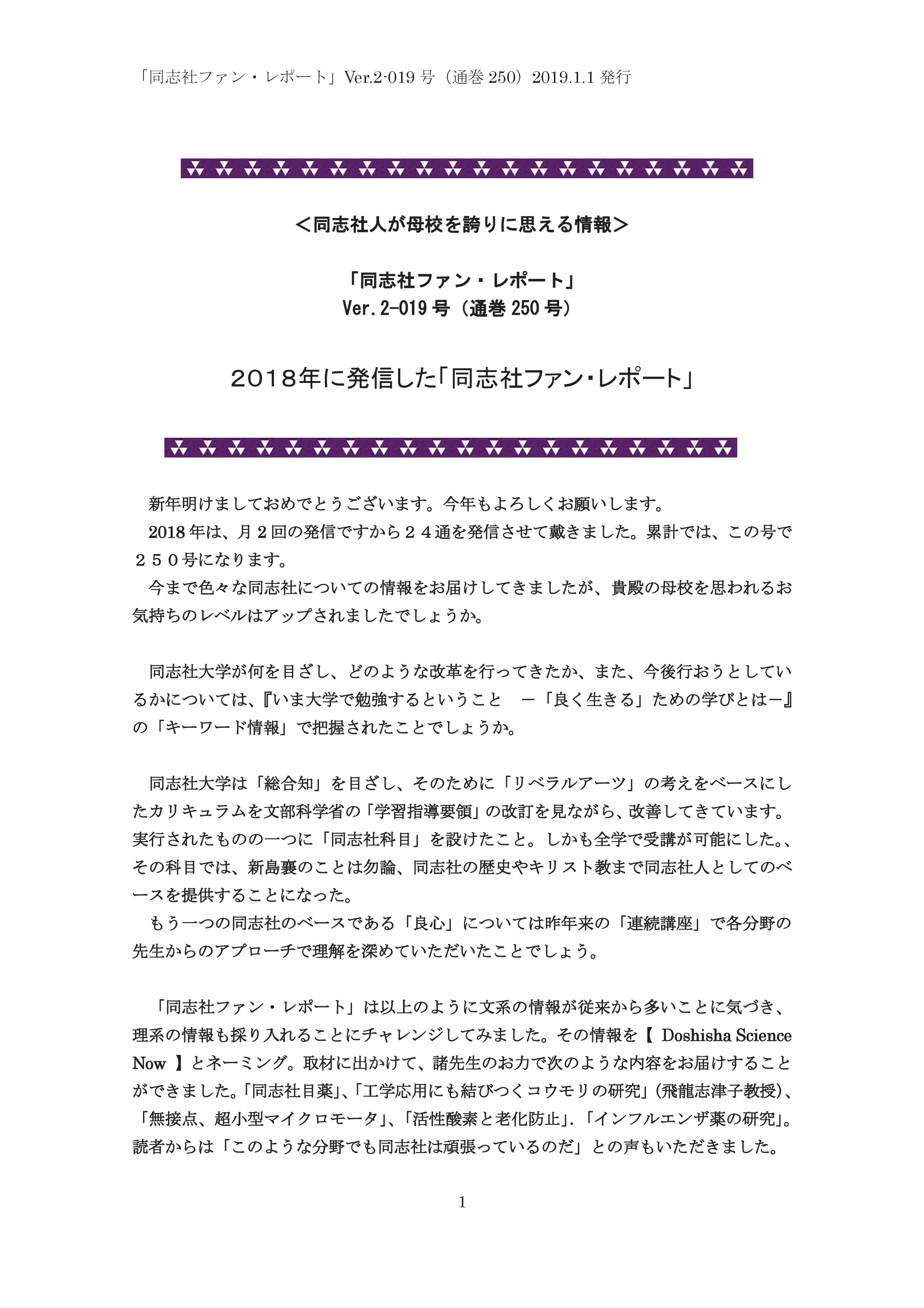 2018年に発信した「同志社ファン・レポート」 Ver.2-019 2019/1/1発行