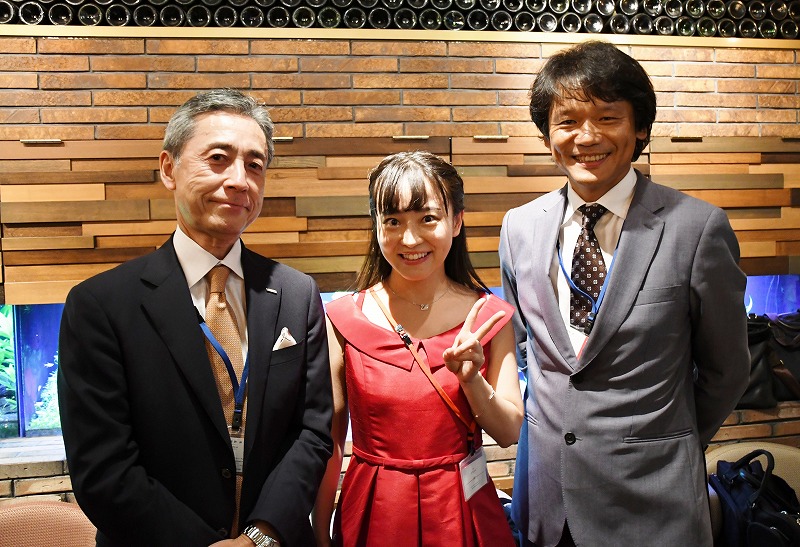 植野伸一副会長(左)、女優の西条美咲さん(中央)、宮坂学会長(右)