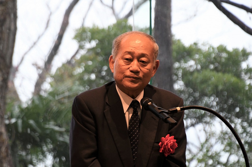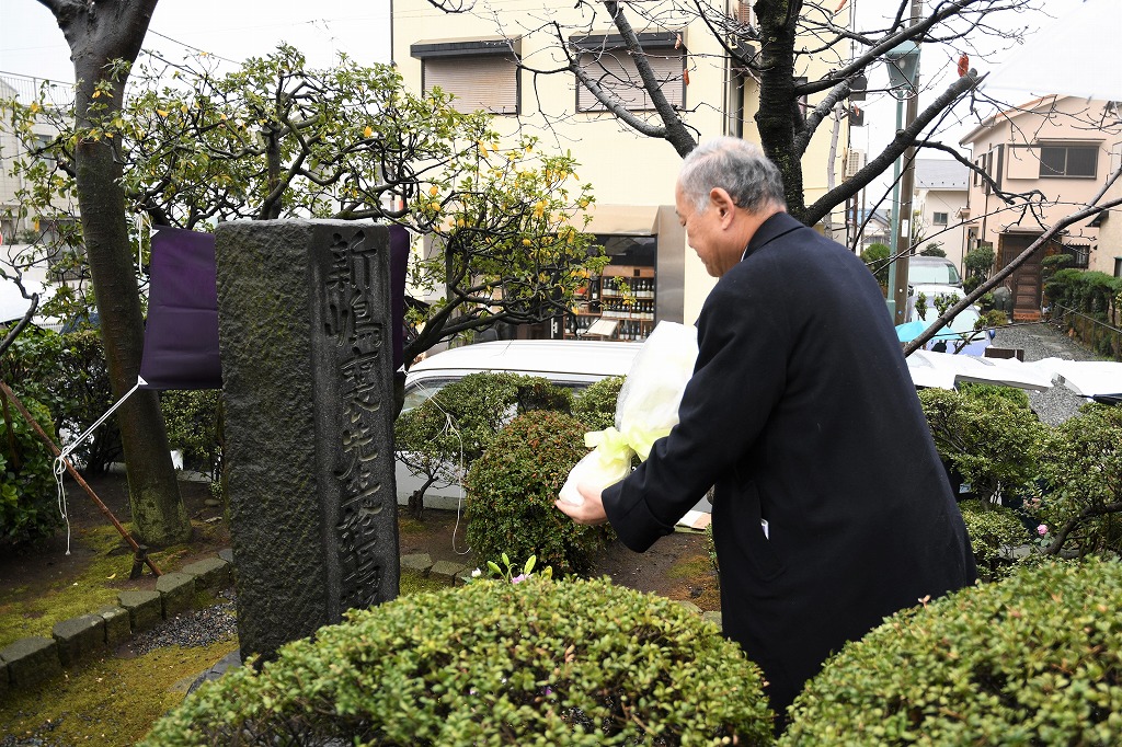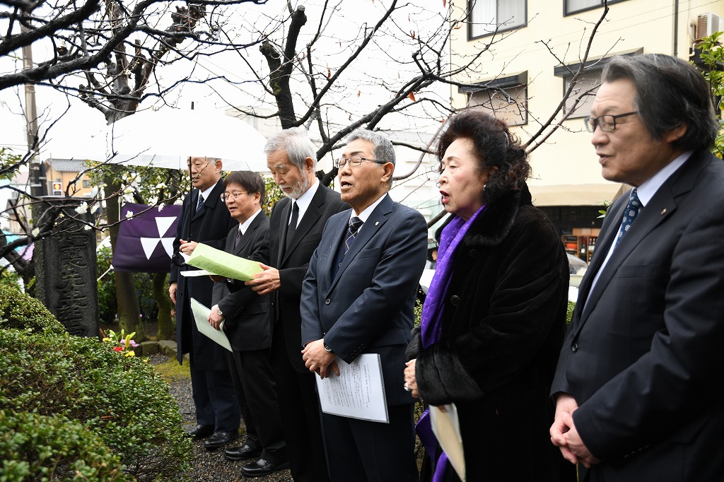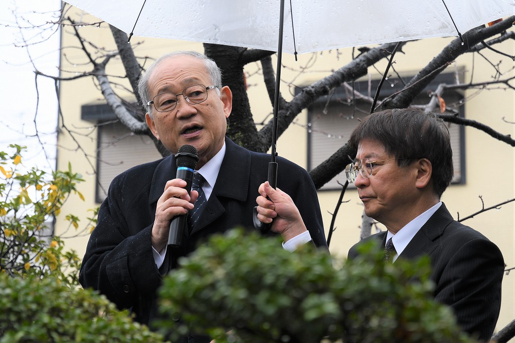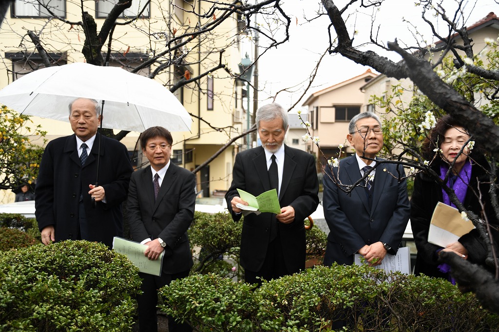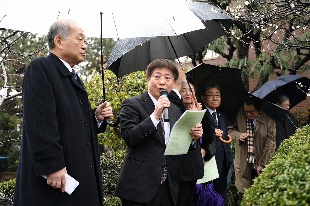 その後、中崎久雄大磯町長・竹村慶三校友会神奈川県支部長のご挨拶、大磯詩吟連盟の皆様による「寒梅詩」「送歳詩」の合吟、和歌「いしかねも」の朗詠と続き、参加者一同による「Doshisha College Song」斉唱、来賓各位による献花と進み、冷たい雨の中ではありましたが、無事式典を終了しました。
