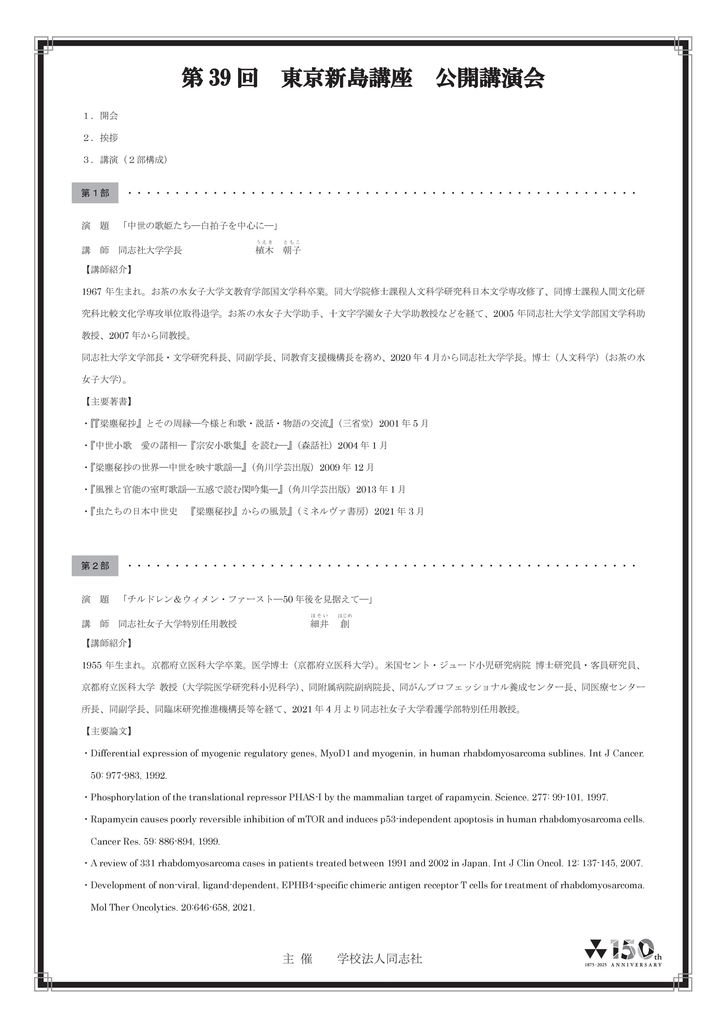 第39回東京新島講座」が、植木朝子 同志社大学学長、細井創 同志社女子大学特別任用教授を